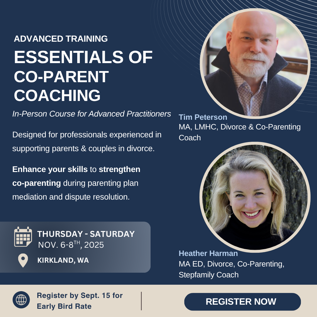 This is an in-person course for those who have advanced experience working with parents and couples going through divorce or separation. Attendees will develop their specific skill set for strengthening co-parenting relationships, including parenting plan mediation and dispute resolution. Participants will roll up their sleeves and practice with instructors and each other. This course is designed to help you deepen your skill and technique in co-parent coaching.